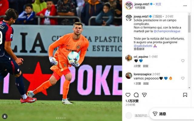 直播吧9月28日讯 本轮意甲比赛,国米在客场以2-0的比分战胜卡利亚里。本场比赛,蓝黑军团门将何塞普-马丁内斯首发登场。