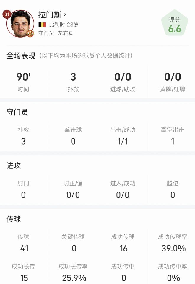 拉门斯首秀数据:3扑救、15次成功长传、出击成功1次
